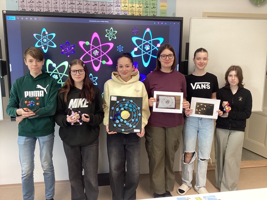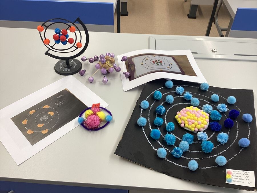 A přišlo i jedno velké překvapení – Mendělejevova periodická tabulka! Žáci zjistili, že je vlastně neuvěřitelně promyšlená. Přestože její autor neznal vnitřní stavbu atomu, dokázal prvky uspořádat tak chytře, že z tabulky dnes vyčteme mnohem víc, než by se na první pohled zdálo. Pak už ale přišla výzva: vytvořit vlastní model atomu. Fantazii se meze nekladly – a bylo to znát. Vzniklo šest originálních modelů z mandarinek, lentilek, vánočních ozdob nebo bambulek. Jeden z nich byl dokonce vytištěný na 3D tiskárně!