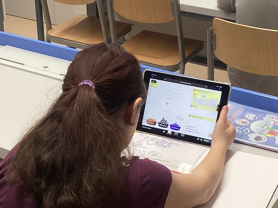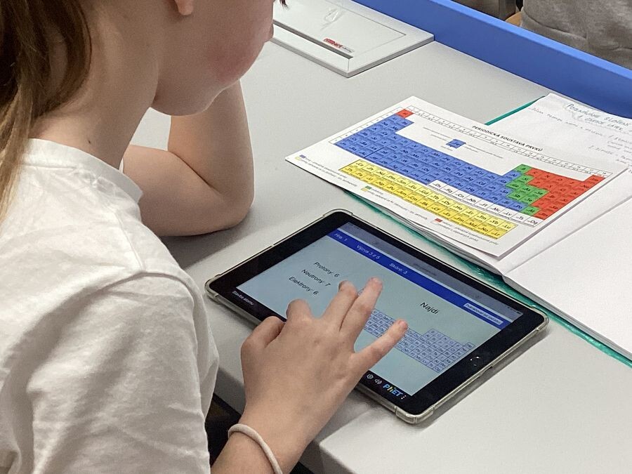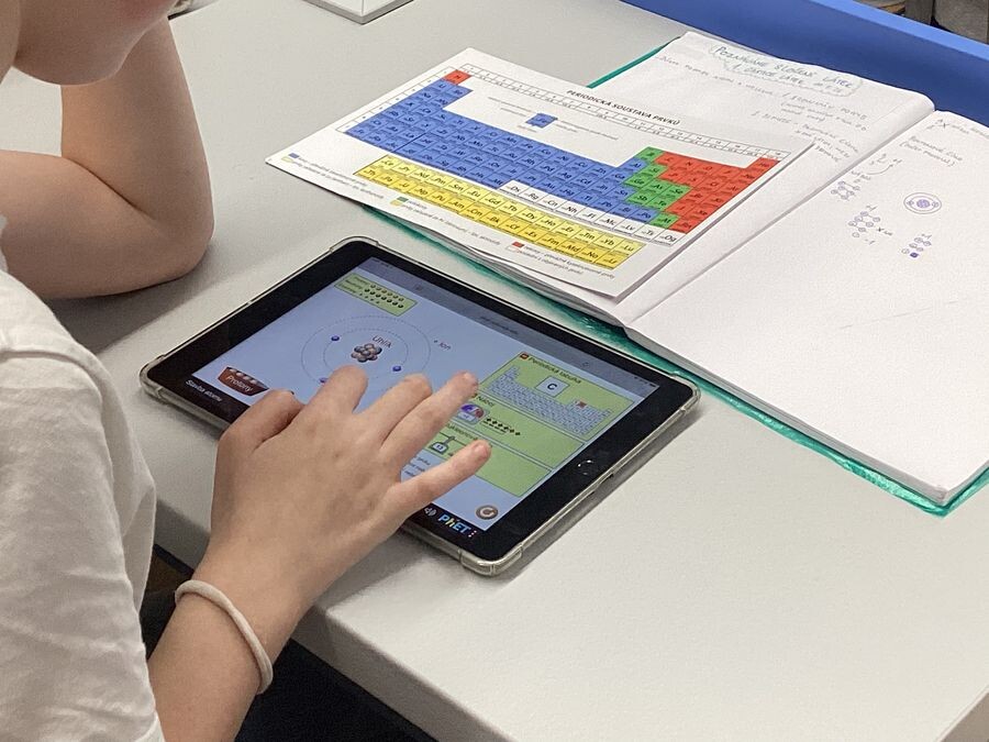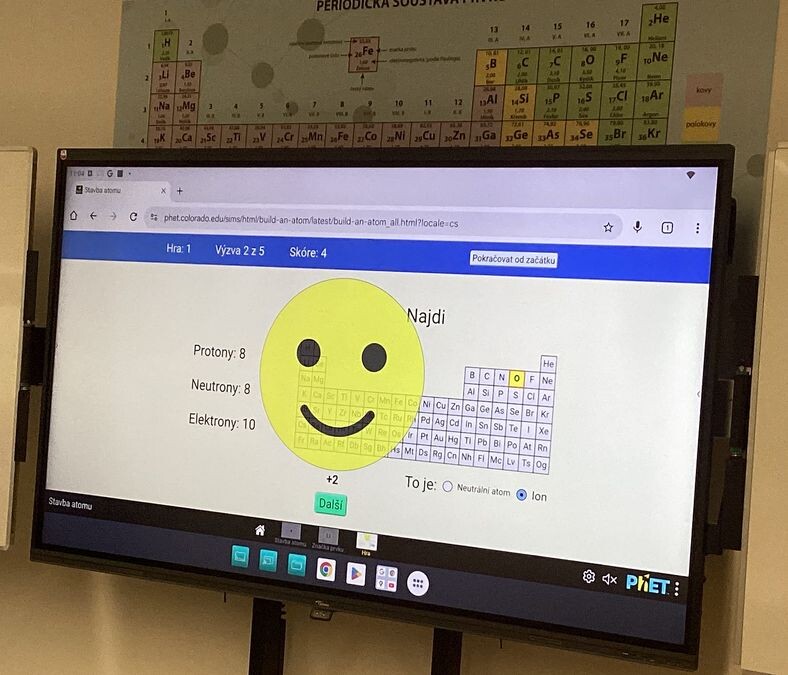 Jak vlastně vypadá atom? A proč se některé látky „kamarádí“ a jiné spolu vůbec nereagují? Na tyto otázky hledali odpovědi žáci 8.B v hodinách chemie. Nejprve se ponořili do teorie – seznámili se s tím, co je atom, jak byl objeven a jak si ho vědci v minulosti představovali. Pak ale přišla ta zábavnější část. Díky interaktivním animacím si mohli atomy doslova „prohlédnout ze všech stran“ a lépe pochopit, jak jsou uspořádané. Velký úspěch měly zejména simulace z platformy PhET. Ty totiž umožňují stát se na chvíli malým vědcem – žáci si mohli sami sestavovat atomy, přidávat nebo ubírat protony, neutrony i elektrony a sledovat, co se stane. Najednou tak dávalo mnohem větší smysl, co znamená protonové nebo nukleonové číslo, a nebyl problém pochopit ani vznik aniontů a kationtů.