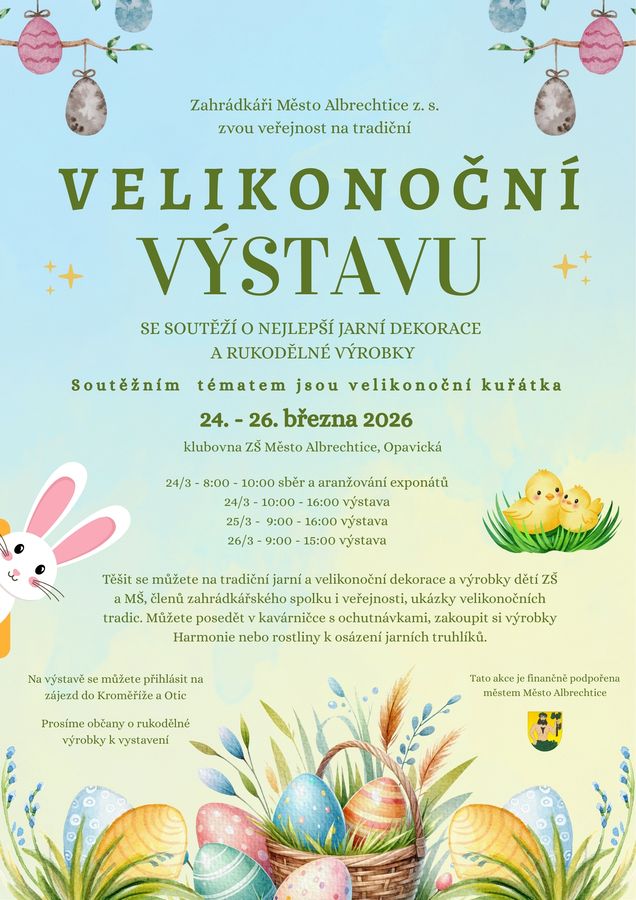 Tradiční velikonoční výstavku s ukázkami rukodělných prací připravili na třetí týden v březnu zahrádkáři z Města Albrechtic. Třídenní oslavy jara se nesly ve znamení soutěží o nejhezčí kuře, malování velikonočních perníčků a zdobení vajíček voskem. Široká nabídka dekorací nabízela pestrý výběr i k zakoupení.
